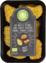 Ingredienten: Kaasnugget: 70% kaasvulling* (25% KAAS*,TARWEbloem*, MELK*, water, zonnebloemolie*,EIgeel*, TARWEvlokken*, HAVERvlokken*,GERSTvlokken*, zeezout, specerijen*), paneermeel*(TARWEbloem*, zout, gist, kurkumapoeder*),zonnebloemolie*, rijstmeel*, TARWEbloem*,TARWEzetmeel*, EI-eiwitpoeder*, zeezout,verdikkingsmiddel (guarpitmeel*). Spinazienugget:46% spinazie*, paneermeel* (TARWEbloem*,zout, gist, kurkumapoeder*), zonnebloemolie*,aardappelvlokken*, TARWEbloem*, zetmeel*,weipoeder* (MELK), rijstmeel*, TARWEzetmeel*,MELKpoeder*, EIwitpoeder*, zeezout, kruiden*en specerijen*, gistextract*, verdikkingsmiddel(guarpitmeel*). Groentennugget: 42% groenten*(paprika*, ui*, erwten*, mais*), paneermeel*(TARWEbloem*, gist, zout, kurkumapoeder*),zonnebloemolie*, aardappelvlokken*,TARWEbloem*, zetmeel*, weipoeder* (MELK),EIwitpoeder*, rijstmeel*, TARWEzetmeel*,MELKpoeder*, zeezout, kruiden* en specerijen*,gistextract*, verdikkingsmiddel (guarpitmeel*).(*=biologische landbouw).